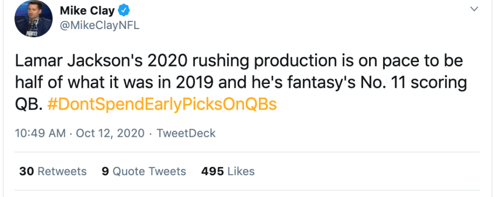 - Justin Herbert is a startable fantasy QB if you’re streaming the position or playing in a deep league. 4 TDs, zero INTs last night. He’s legit. That first TD he threw to Keenan Allen, where he was rolling out of the pocket and threw the ball to him on the run–that was a big-time NFL throw. This kid has serious talent. He can throw it on the run, he doesn’t seem to get rattled in the pocket, and he can throw the deep ball. No, he hasn’t won a game, yet, but he would’ve beaten the Saints in New Orleans if “The Money Badger” (Michael Badgley, the Chargers’ kicker) could hit a 50 yarder. The kid was told after the coin toss that he was the starter the Week 2 game against the Chiefs, and he held his own with Mahomes. Imagine being a rookie QB in your second career week in the NFL and being told minutes before kickoff that you’re suddenly the starter against Mahomes and the defending Super Bowl Champions. Justin Herbert is a stud, both in real life and in fantasy. Pick him up.