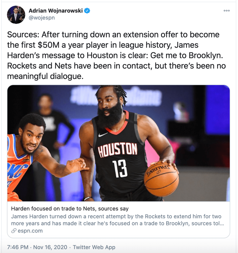 - The biggest risk the Rockets run is playing too much hardball with Harden and gaining a reputation around the league as not being “player-friendly.” That kind of stuff gets around and if players have a bad perception of the Houston front office, it will impair Houston’s ability to land big free agents and keep good players. Plus, at this point, it’s hard not to sympathize with Harden not wanting to be a part of a rebuild at age 31. He’s been nothing but a model citizen in Houston over these past 7 years, and given them tons of memories and winning seasons. He won an MVP there. If you’re Houston, you probably have an obligation to do right by a guy who will go down as one of the best Rockets ever.