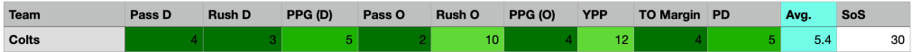 - Colts (5.4): The Colts are the only team in the league ranked highly in all 9 categories. Their lowest category is yards-per-play, where they rank 12th in the league, which is still good. I doubt anyone thinks the Colts are the best team in the league (I had them at #5 in my most recent power rankings), but the numbers show that they’re probably the most complete team in the league. Or, put another way, the team with the fewest weaknesses. I personally don’t believe the Colts are the best team in the league, but they are the best team statistically. There’s nothing they do poorly. They’re at least average in every category.