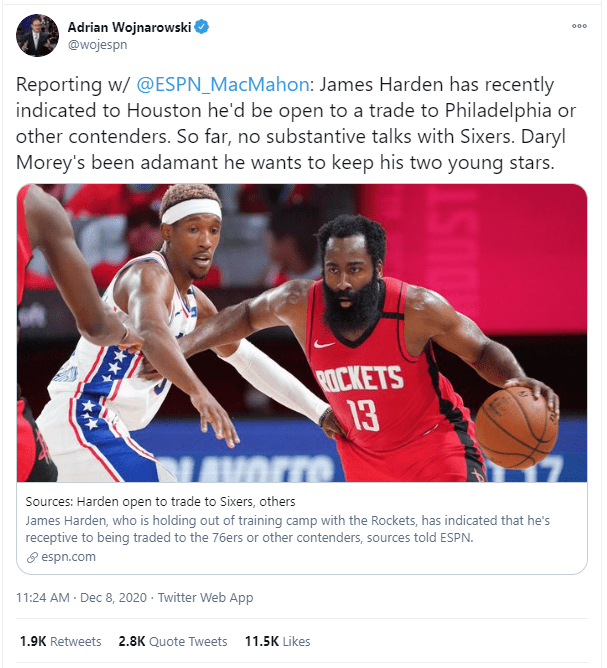 Woj just reported today that James Harden is open to being traded to the 76ers or another contender. But the 76ers were specifically named: