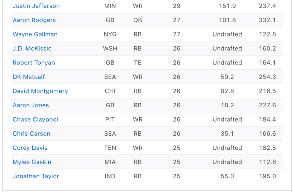 Kelce’s 290 fantasy points put him ahead of all but 2 running backs in PPR (Alvin Kamara & Dalvin Cook) and all but 2 wide receivers (Stefon Diggs & Tyreek Hill). There’s a great case to be made for him as the Fantasy MVP this year. And, speaking of Stefon Diggs, him too. He had a 6th round ADP in drafts and he’s now the WR1.