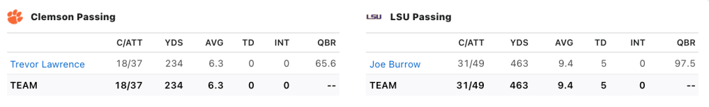 His numbers in that national championship game were mediocre. Joe Burrow outplayed him significantly. And it’s not like that LSU defense was elite or anything. They let up 38 points to Texas’ Sam Ehlinger early in the season, and Texas was not a great team. Nobody thinks of Ehlinger as this unbelievable passer and QB prospect. But he did better against LSU than Lawrence did.
