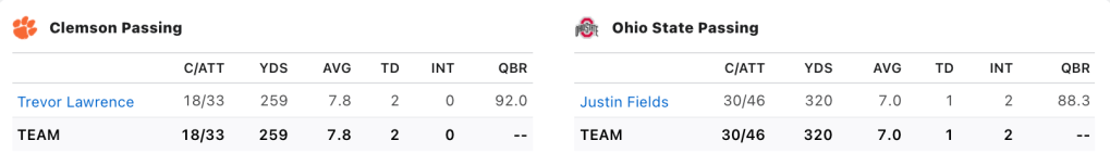 So we now have two major games where Trevor Lawrence was outplayed by the other team’s QB, and arguably a third. I know Fields had the two picks in the 2019 game, but if you go back and watch that game, it’s hard not to come away with the feeling that Fields was the one making the tougher throws.