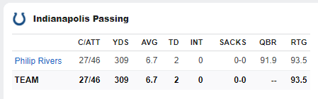 As for the Colts, you’ve gotta give Philip Rivers some major credit for his performance in that game. Take a look at this statline:
