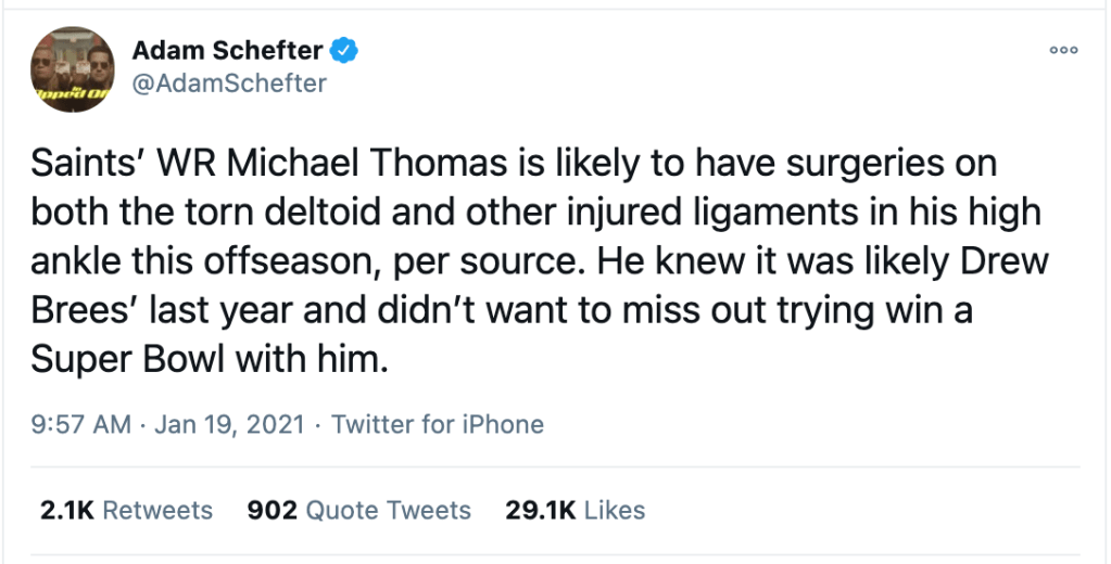 So hopefully Michael Thomas will be back to his normal self in the 2021 season.