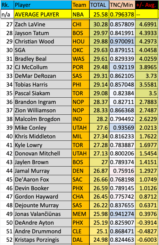The chart will show the player’s rank, his total TNC, his total TNC divided by minutes per game, and then finally the “+/- Avg.” column shows how much more or less he contributes to his team over the average, per game.