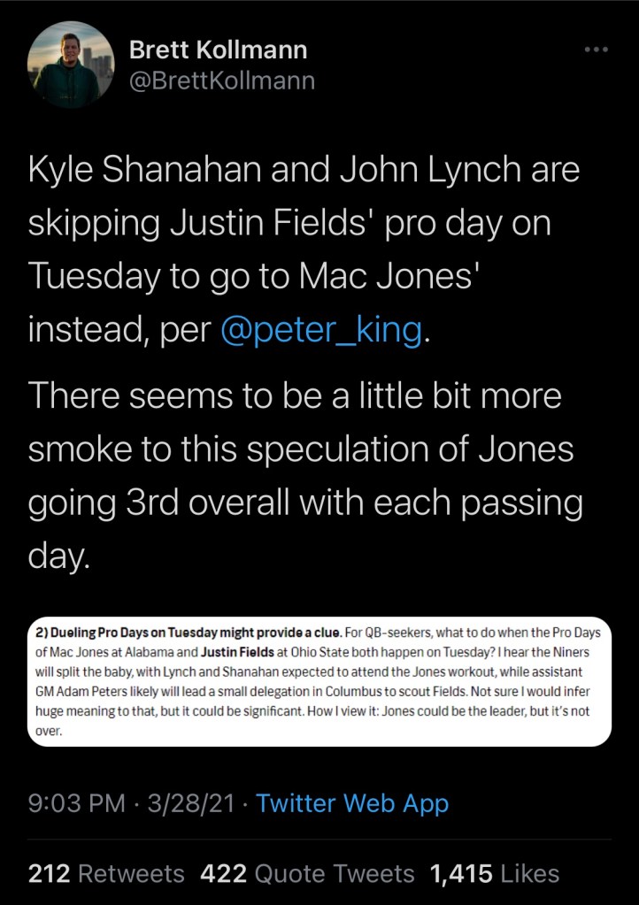 This to me speaks volumes about the 49ers intentions here. Actions always speak louder than words, and the 49ers are clearly signaling their preference for Jones over Justin Fields here.