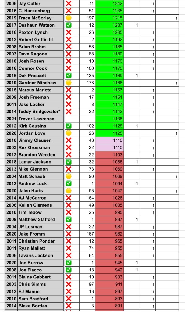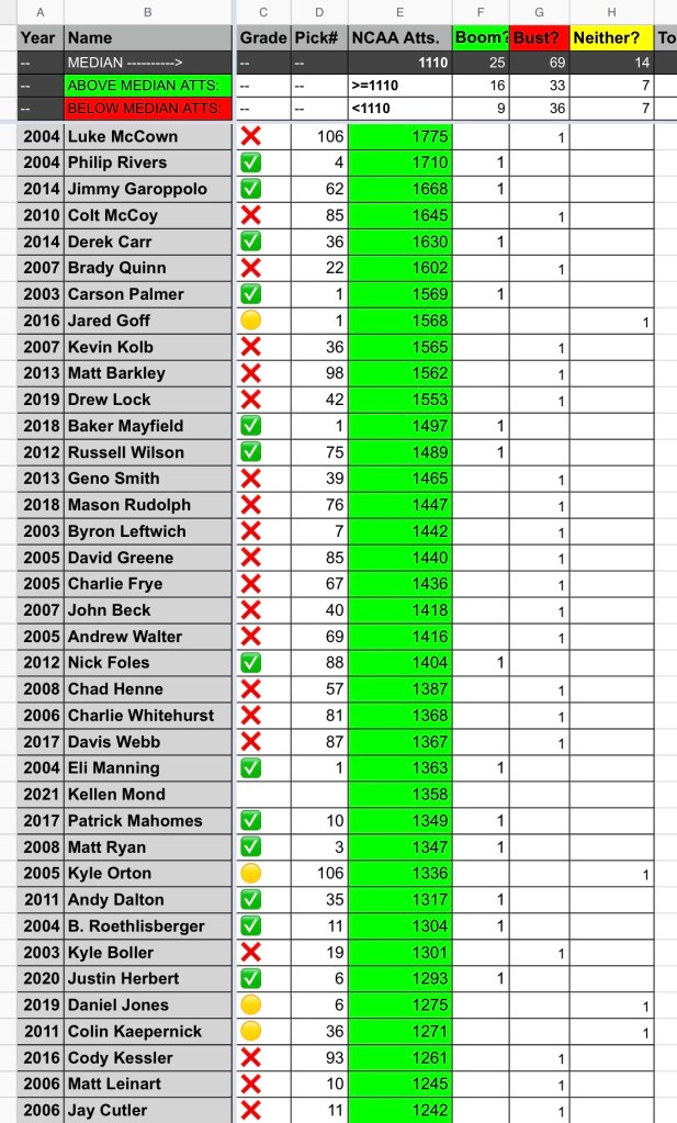 Remember, the median since 2003 is 1110 career college pass attempts. (Patrick Mahomes had 1349, Baker Mayfield had 1497, Russell Wilson had 1489, Justin Herbert had 1293, for reference.)