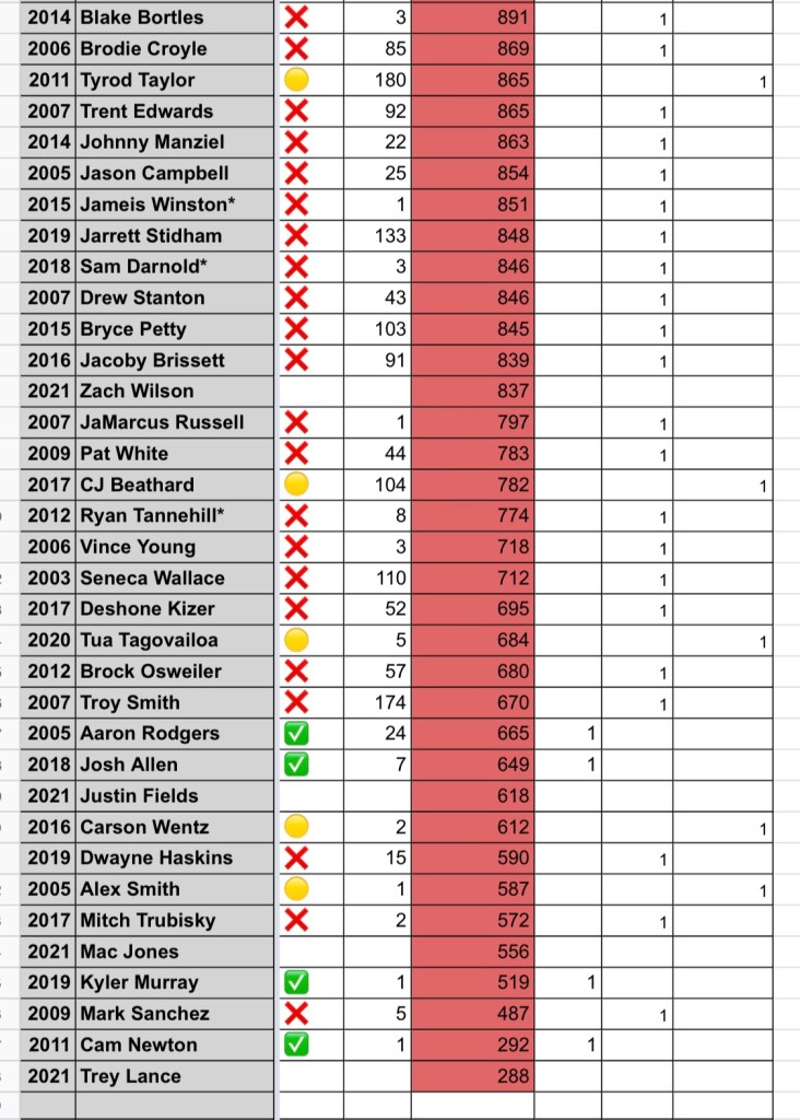 So many of the most well-known busts of the 21st century are in that “below the median” grouping: Tim Tebow, EJ Manuel, Sam Bradford, Johnny Manziel, Blake Bortles, Jameis Winston, JaMarcus Russell, Vince Young, Dwayne Haskins, Mitch Trubisky, Sam Darnold, Mark Sanchez.