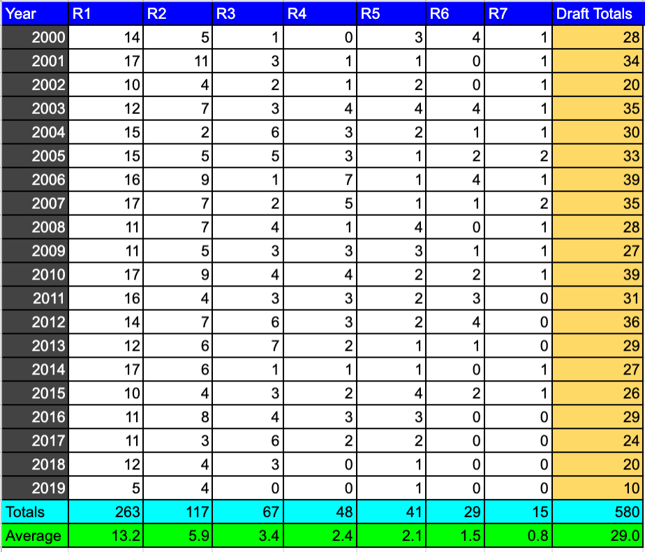 But on average, unsurprisingly, you’re going to find the most Pro Bowlers in the first round. The first round averages 13.2 Pro Bowlers per year, and that number is slightly reduced by the inclusion of 2018 and 2019 in the average.