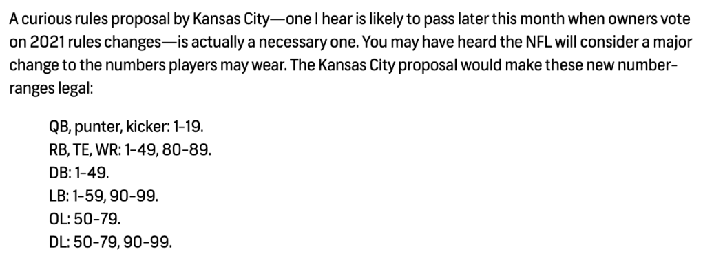However, according to Peter King, the NFL is likely about to approve a rule change, proposed by the Kansas City Chiefs, that would allow significant changes to the numbers players are allowed to wear: