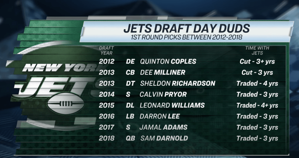 You can even go back to 2012: the Jets drafted Quinton Coples, a defensive end. He was out of the league by 2015. When the Jets miss, they miss big-time.