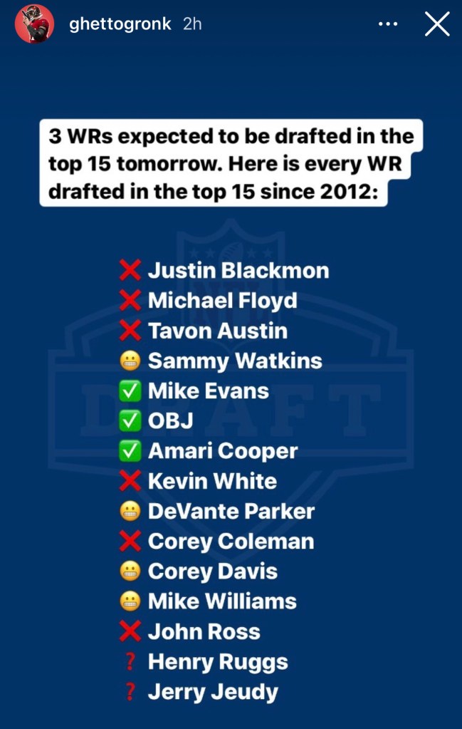 This means we shouldn’t be sleeping on guys who are considered second, third or even fourth-tier receivers in this draft. Kadarius Toney, Rashod Bateman, Rondale Moore, Elijah Moore, Terrace Marshall, Tylan Wallace, Dyami Brown, Amari Rodgers, Amon-Ra St. Brown–there’s a ton of guys who aren’t getting much attention that could turn into stars someday. Obviously not all of these guys will pan out, but I’m sure at least a few of them will outperform some receiver who will be drafted in the first round tomorrow night.