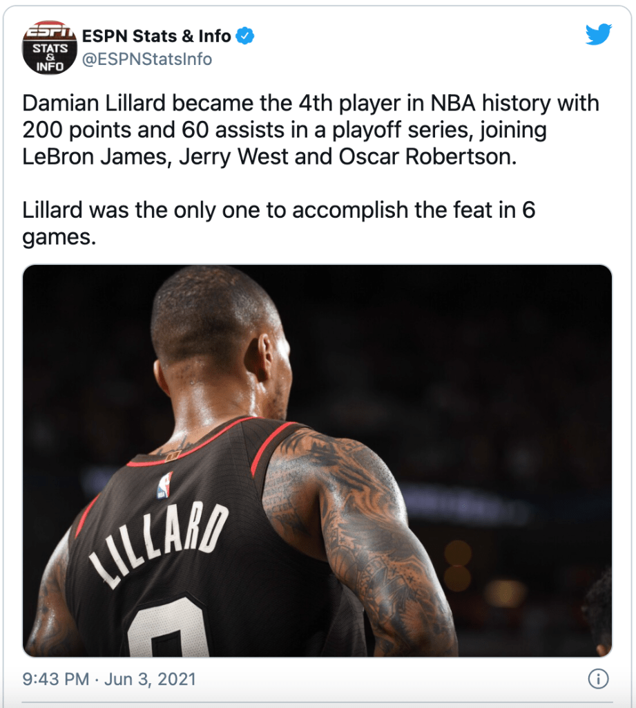 Dame put up absolutely stupid numbers in that series, but when your team can’t get stops, it really doesn’t matter how much you score because it’ll never be enough. In game 5, he dropped 55 and his team lost in double overtime. In game 2, he dropped 42 and his team still lost by 19!