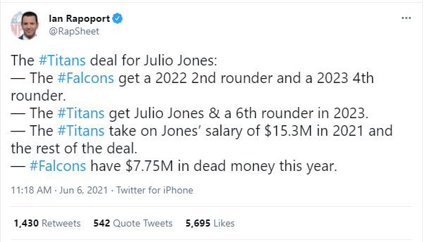 They passed on drafting Justin Fields or Mac Jones at #4 and went for Kyle Pitts in a move that seemed to signal they were not looking to rebuild. But trading Julio Jones is definitely a rebuilding move.