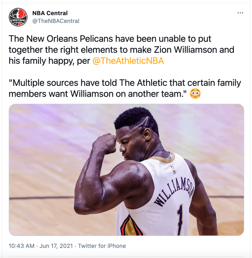 Look, when I hear that Zion’s family wants him out of New Orleans, to me that’s code for “Zion wants out of New Orleans.” That much should be pretty obvious. I’m sure they’re all on the same page. But Zion’s camp probably didn’t want to rock the boat too much by blatantly coming out and saying, “Yeah, Zion’s unhappy here.” So they cushioned the blow somewhat by framing it as “Zion’s FAMILY wants him out of there.”