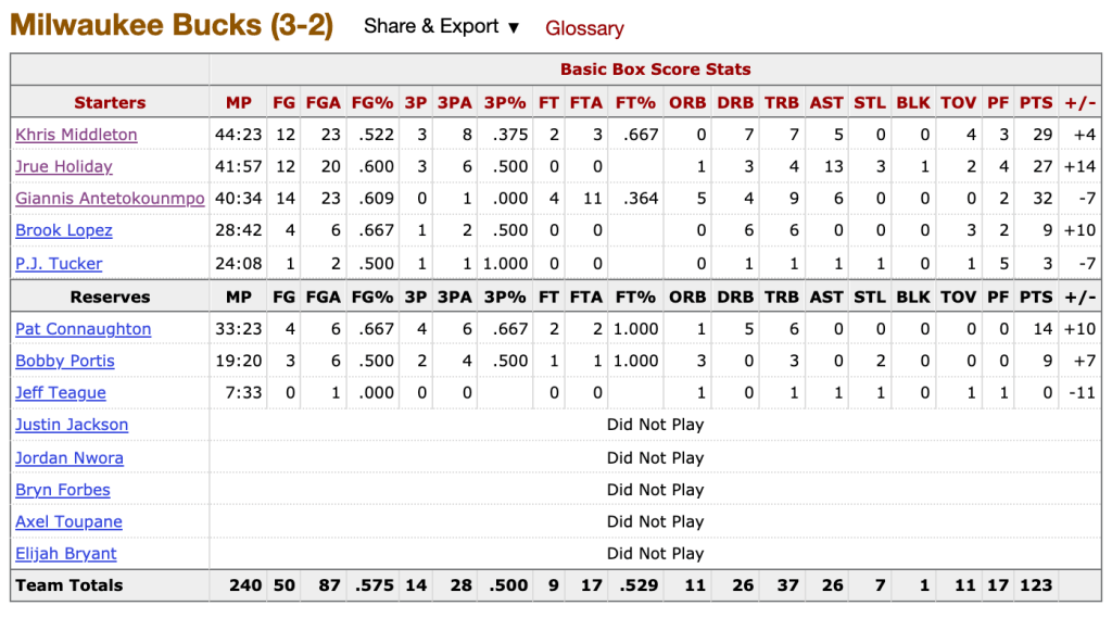 You look at the stats and everyone on Milwaukee was great. Somehow Giannis was a -7 in the game, which is not normal for him in this series, but it was okay because his teammates finally stepped up. And he still had an efficient 32, 9 and 6. Milwaukee’s Big Three combined for 88 points on 38-66 shooting from the field. Overall, Milwaukee shot 57.5% from the field and 50% from three.