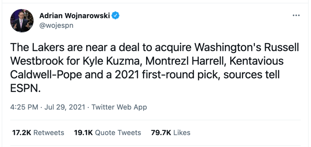 Wow. Just this morning, it seemed like the Lakers were extremely close to acquiring Buddy Hield from the Kings, but now things have taken a major turn and it appears the Lakers will be trading for Russell Westbrook. Maybe the Buddy Hield stuff was a smokescreen.