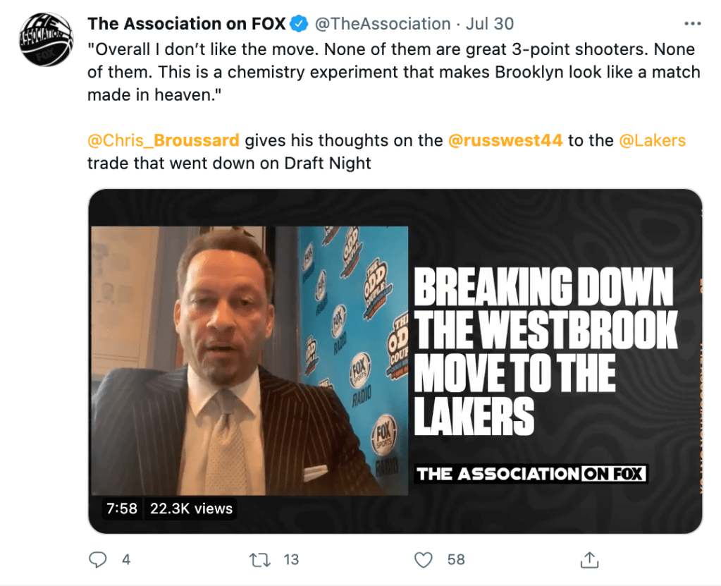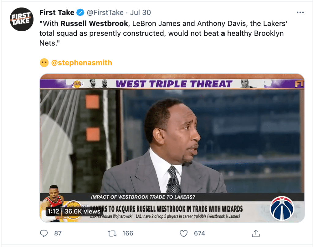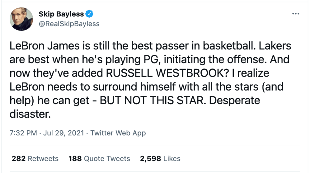 We can’t allow the same guys who are now saying, “Westbrook won’t work in LA,” to say “Well of course the Lakers won it all, they’re a Superteam,” a year from now if and when the Lakers win it all. There needs to be accountability in the media.