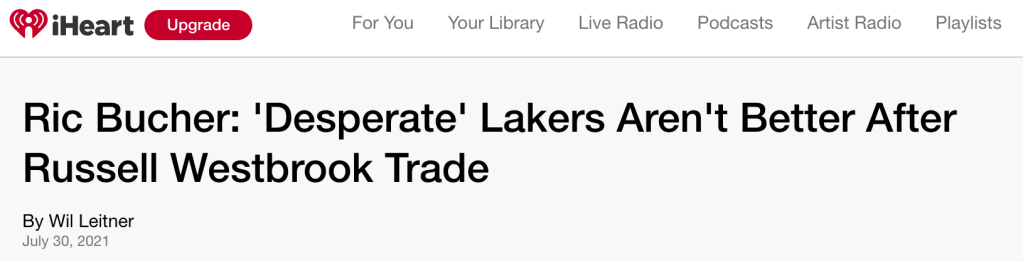For instance, a lot of the sports media right now is blasting the Westbrook to LA move. They’re fretting about “spacing,” and the lack of three-point shooting on the Lakers roster. Some are more vehement in their criticism of the move, predicting that it will be a disaster for the Lakers.