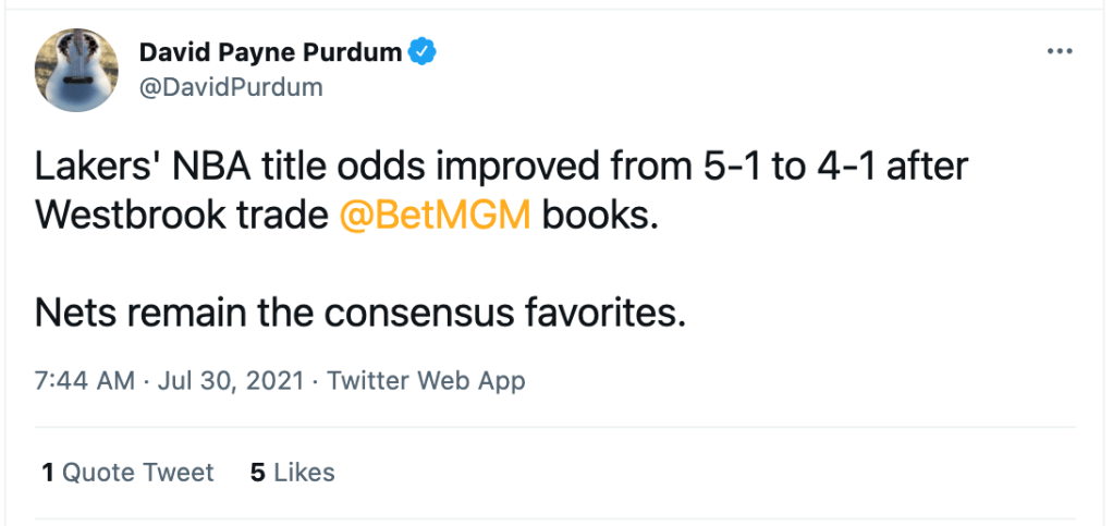 But what if, in a year, the Lakers are 2022 NBA Champs? Vegas certainly thinks it’s possible, as they have the Lakers at +400 to win it all, best odds of any team in the West, and behind only Brooklyn who is +225. And the Lakers’ odds improved after acquiring Westbrook: