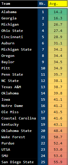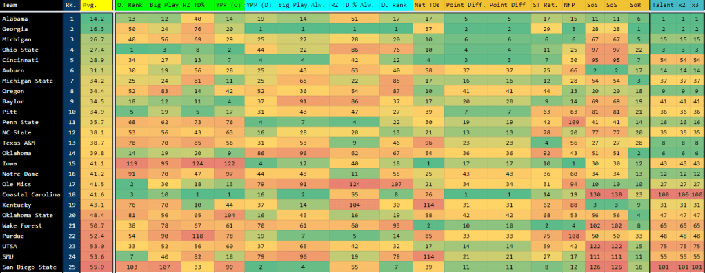 I’ve done the same thing for college football that I do with NFL teams: average out their statistical rankings in a select number of categories I’ve deemed most important and used that to rank them 1-25. Only teams in the AP top 25 are eligible for consideration here, just for simplicity’s sake because it would take an extremely long time to rank out all 130 teams in the FBS.