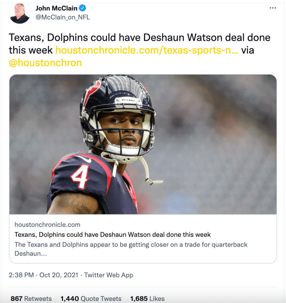 Not only that, but we can infer from this that the Dolphins are not scared away by all the legal troubles surrounding Watson right now. At the very least, they must not believe they’ll compromise his entire NFL career. They might be willing to tolerate a suspension of some kind, but they must not believe this is something that will possibly result in him going to jail and being done in the NFL for good.