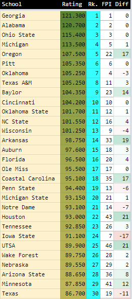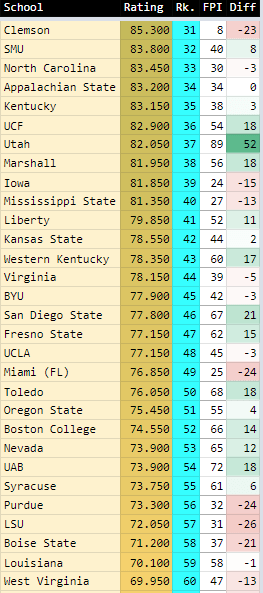 I include the ESPN FPI rankings so you can see side-by-side how mine compare to theirs. Let’s go over some of the biggest differences: