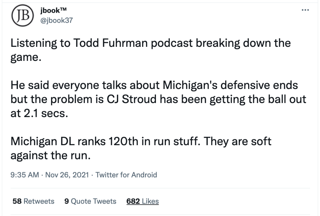 The Michigan defense got absolutely gashed by Kenneth Walker, who ran for 197 yards and 5 TDs on 8.6 yards per carry. Treyveon Henderson of Ohio State may not be on Walker’s level quite yet, but like Walker, he’s a home run hitter who can house it from anywhere on the field. And Henderson is running behind a much stronger offensive line than Walker was. Ohio State also has a deeper stable of running backs, all with different specialties. It’s not just Henderson.
