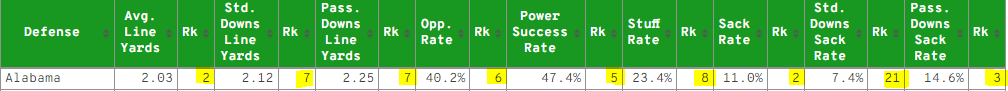 Fortunately for Alabama, while their offensive line is pretty bad, their defensive line is unquestionably elite. They rank highly in just about everything: