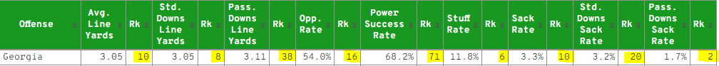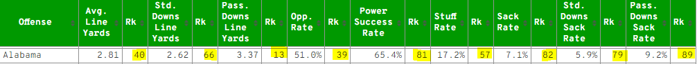 Let’s take a look at the Bama offensive line’s advanced stats from Football Outsiders: