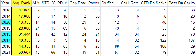 Here’s what we have: 44th in average line yards allowed, 18th in standard down line yards allowed, 80th in passing down line yards allowed, 10th in opportunity rate, 25th in power success, 40th in stuff rate, 9th in sack rate, 18th in standard downs sack rate, and 8th in pass downs sack rate.