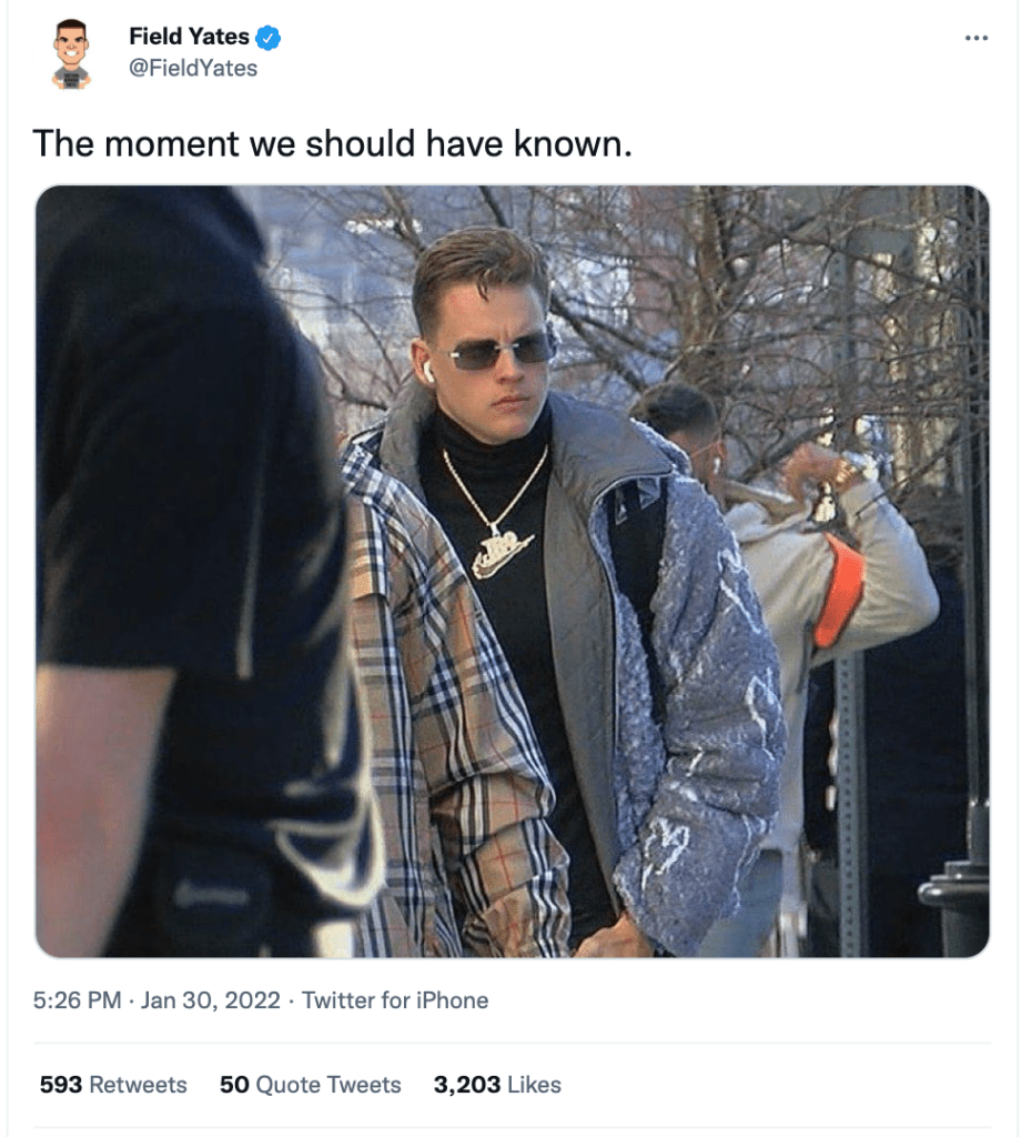 I should have put my entire life savings on Bengals moneyline the moment they showed Burrow walking up to the stadium looking like fucking Bel Biv Devoe.