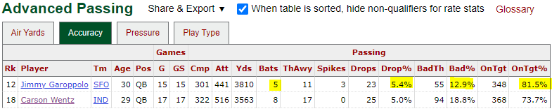 Jimmy G’s receivers dropped a higher percentage of his passes and he still had better figures. Garoppolo’s bad throw percentage was way lower than Wentz’s, and his on target throw percentage was considerably higher. Garoppolo is a significantly more accurate QB than Wentz.