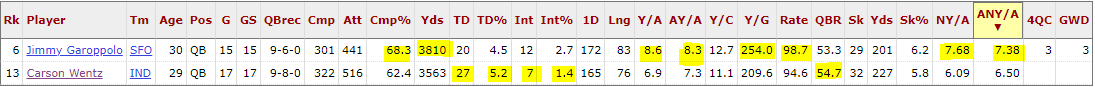 By most measures, Garoppolo was the better QB last year, but in two of the most important stats–TDs and INTs–Wentz was better. Still, I think Garoppolo was better, because if we dig into the advanced stats, they, too, favor Garoppolo: