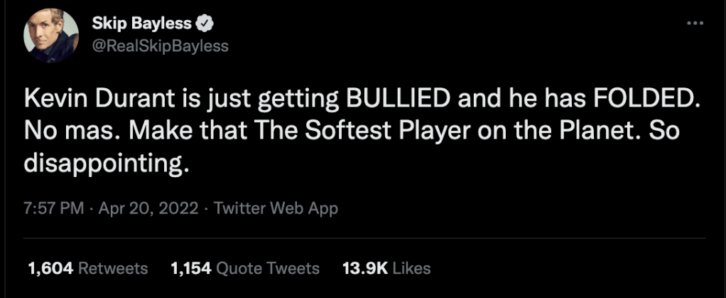 If people are going to call KD the best player in the world, then he’s going to get treated like he’s the best player in the world: he’s going to get scrutinized like he’s the best player in the world. If he is not absolutely perfect on a second-to-second basis throughout his whole entire life, he is going to get absolutely destroyed. That’s what LeBron has dealt with for 12 years now, and still deals with at the age of 37. You want the crown? You have to deal with that, then.