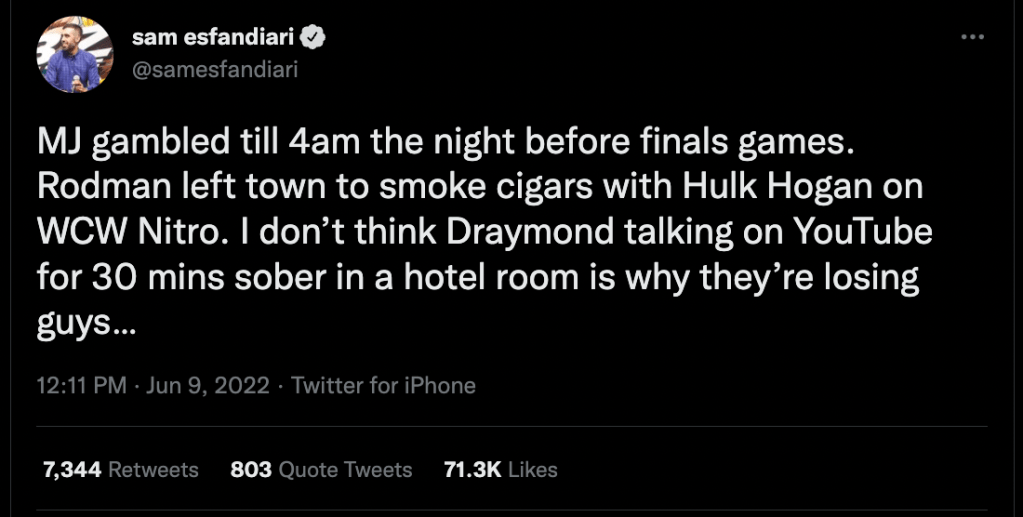 - Both things can be true: the traditional sports media feels threatened by Draymond and what he represents in their space, and so they’re eager to pounce and trash him. But Draymond also didn’t have a good game at all, that’s a fact as well.