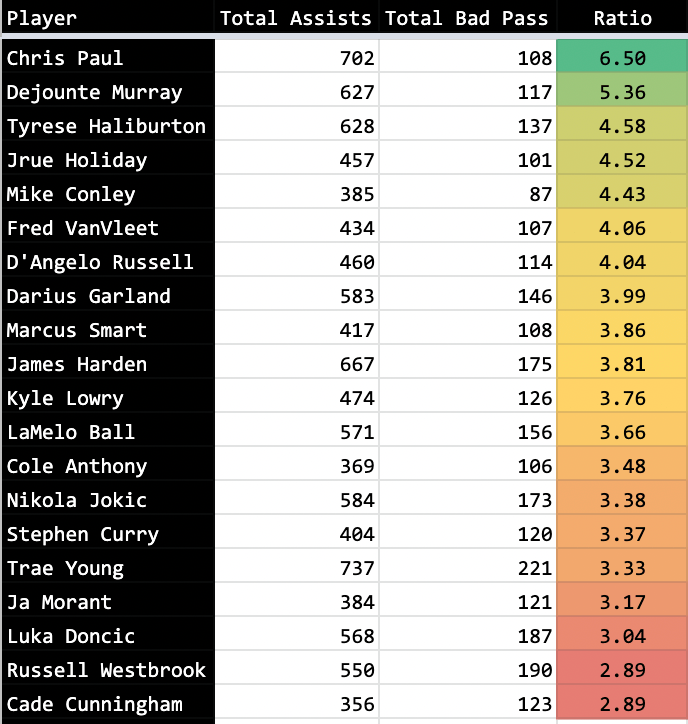 - If we break this down by “Assist-to-Bad Pass Ratio,” Russ was terrible. Russ only averaged 2.9 assists for every bad pass turnover, and if you look at how that compares other point guards who Russ is supposed to be comparable to, he’s way behind.