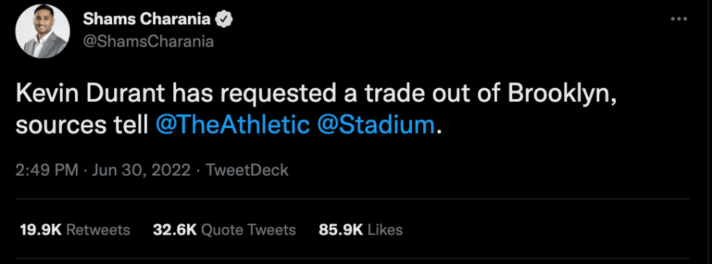 - While the Nets are definitely going to grant KD’s wish here, they have a lot of discretion over where they want to trade him. They can take the best offer on the table. Potential suitors don’t really have to be worried about if KD wants to play for them or not because KD still has 4 more years left on his deal. It runs through 2026. He doesn’t really have a ton of leverage here in terms of dictating where he wants to go. Whoever trades him has his contract for 4 more seasons.