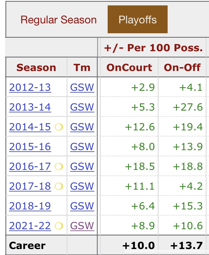 Let’s go back to Jason’s original tweet that kicked this off. The team was +117 when Draymond was on the floor in the playoffs and -6 when he was off.