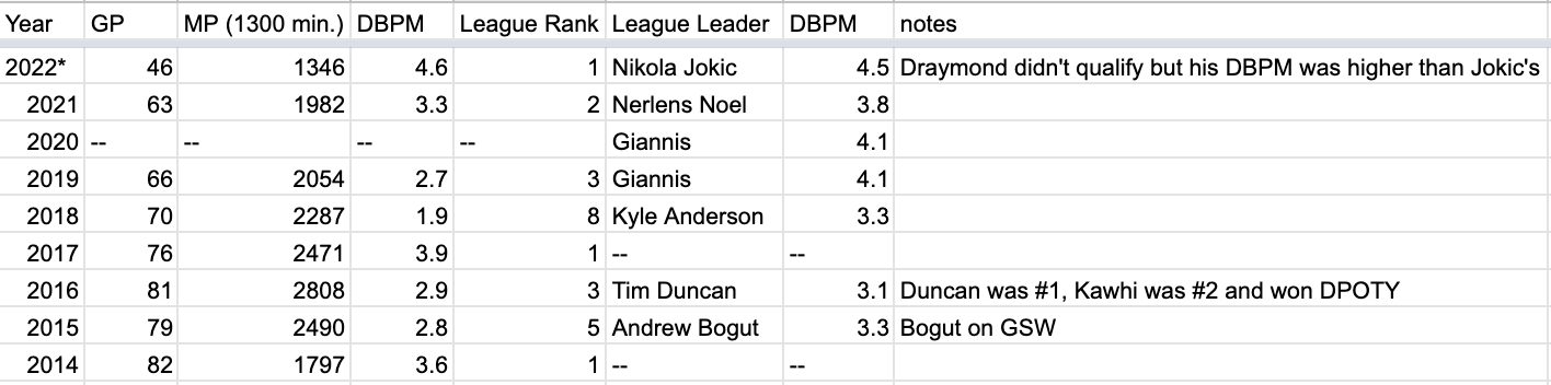 Draymond has never finished lower than 8th in DBPM since 2014, and he has been tops in the league in DBPM twice, officially, over that span (three times unofficially).