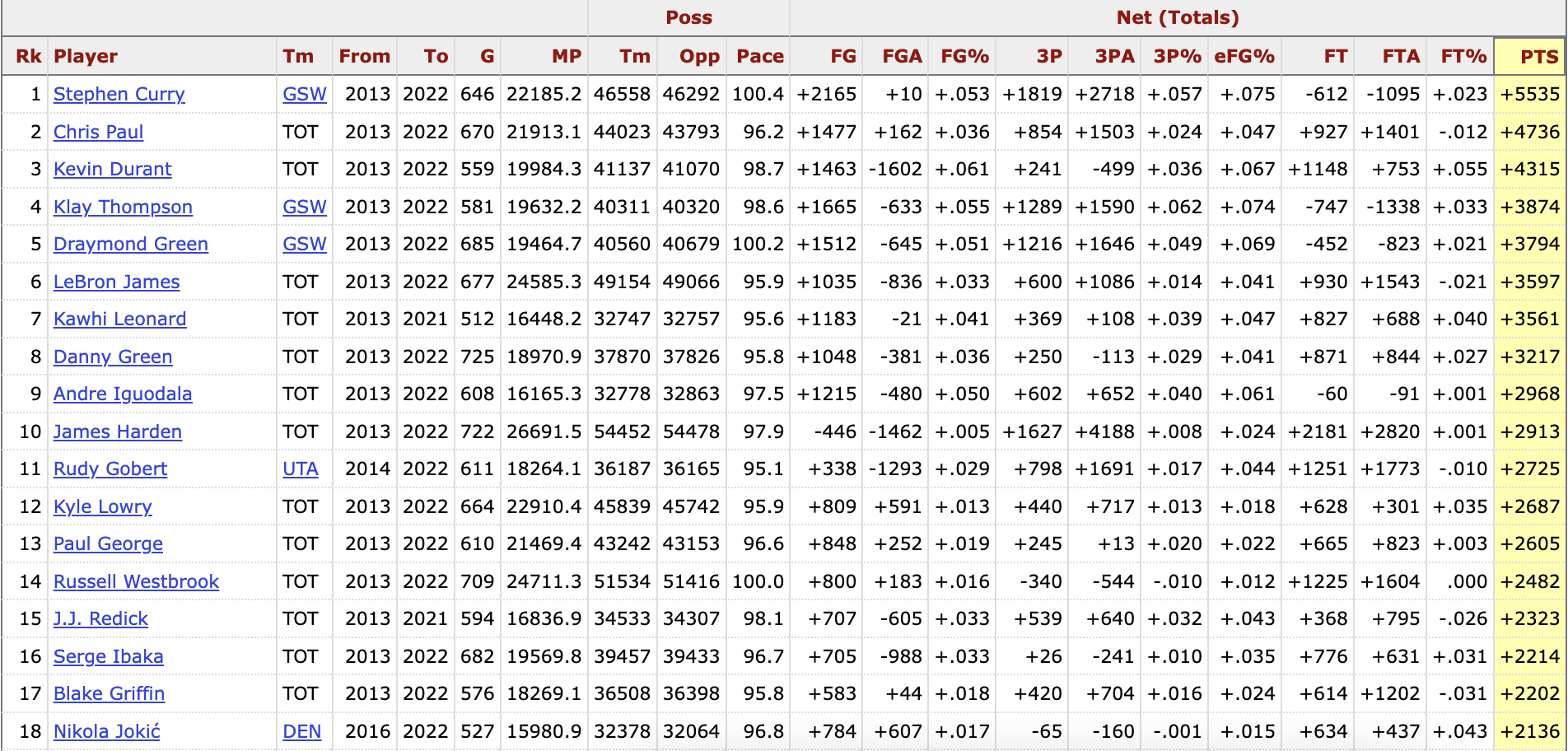 Now, you will notice that the top players (other than Chris Paul) are Draymond’s teammates (or in KD’s case former teammates), and that’s not a coincidence. The Warriors have been the most successful team in the NBA over the past decade, so this make a lot of sense.