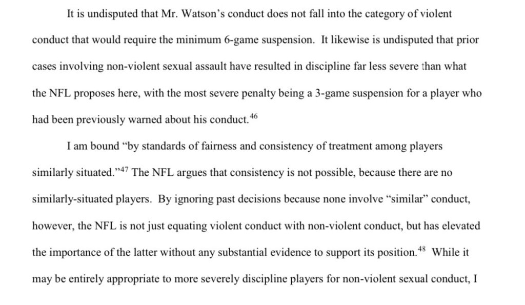 But the judge said that the NFL had not yet changed its policy on sexual misconduct prior to the Watson allegations dropping, so it would be unfair to hold Watson to these new policy standards.