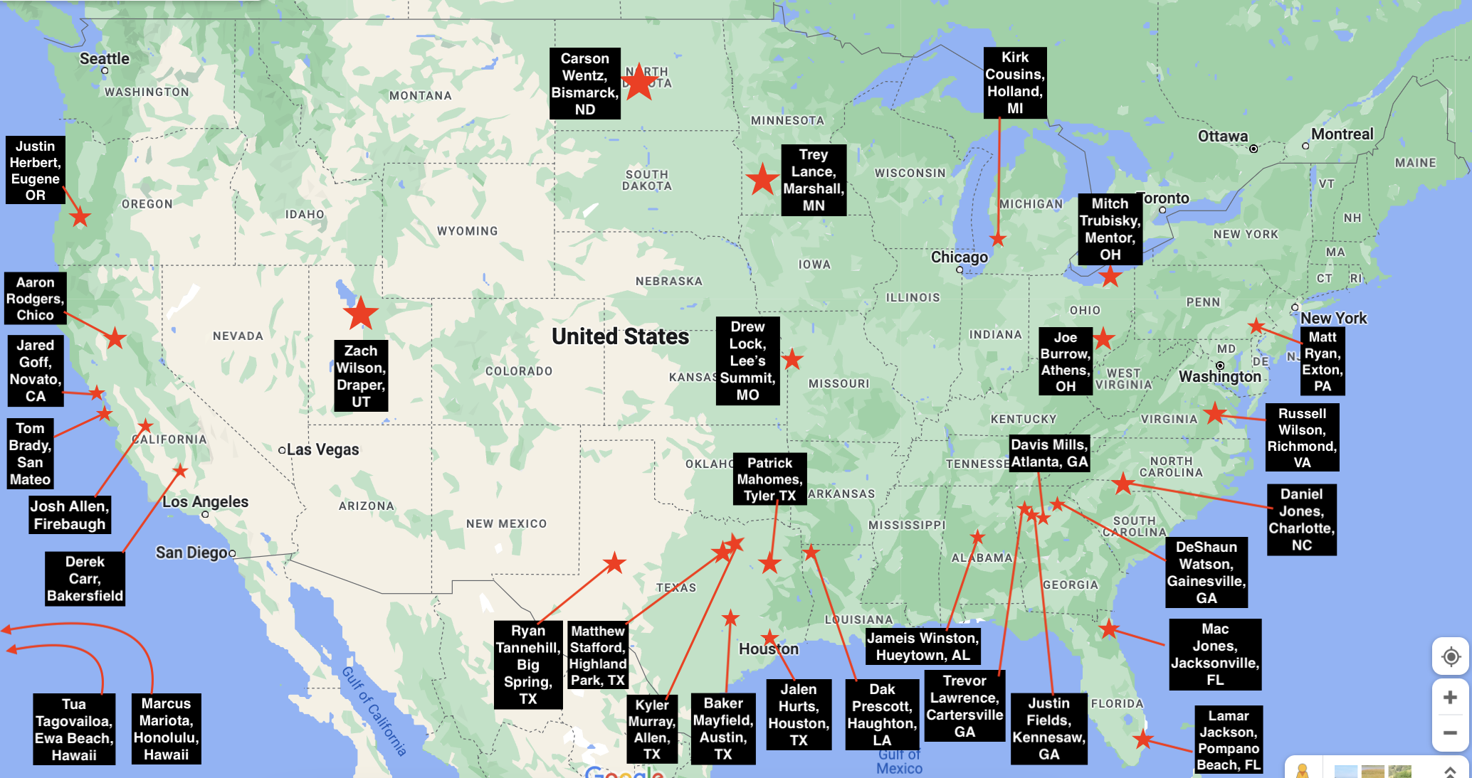 I wanted to see if there were any geographical trends in where the current NFL starting QBs come from, and it turns out, there are strong trends: