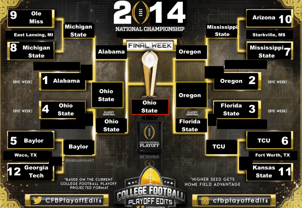 Once they scrapped the BCS and implemented the 4-team CFP, the BCS model was immediately discredited. Do you remember that? In 2014, the first year of the CFP, the 4-seed, Ohio State, won the whole thing. They beat the #1 seed Alabama in the semifinal, and then beat the #2 seed Oregon in the Championship game.