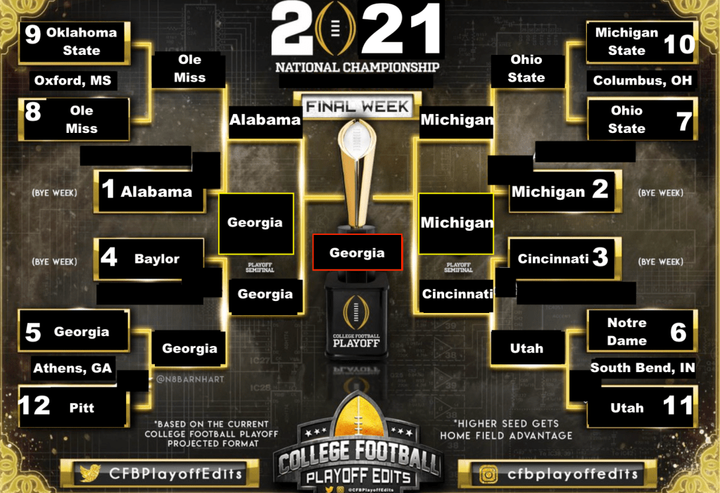 So we now have Bama vs. Georgia in the Cotton Bowl and Michigan vs. Cincinnati in the Orange Bowl. It’s the same Final Four we ended up with in the 4-team playoff scenario, just with opposite matchups. Georgia beats Bama, Michigan beats Cincinnati, and then Georgia trounces Michigan in the Natty. We saw Georgia beat Michigan in dominant fashion in the semifinal in real life, so we don’t really have to wonder how that game would’ve gone.