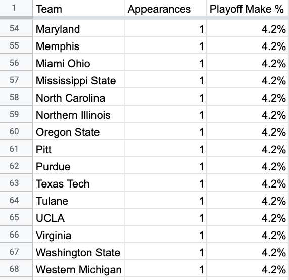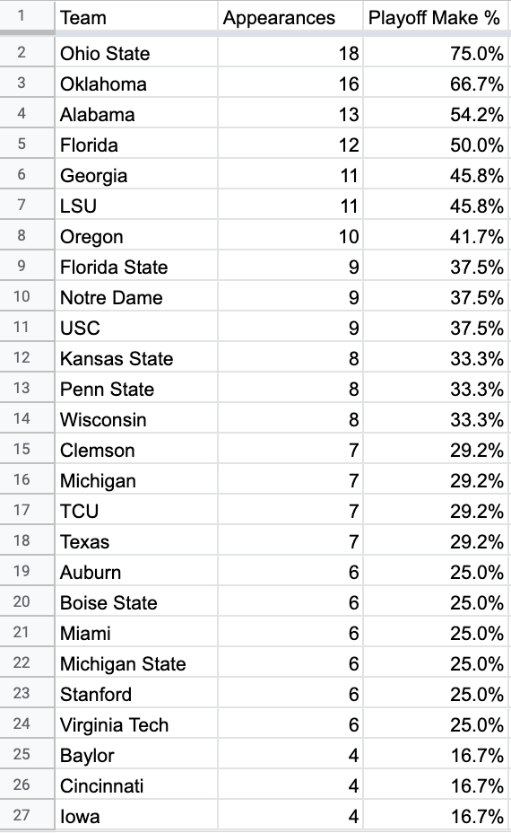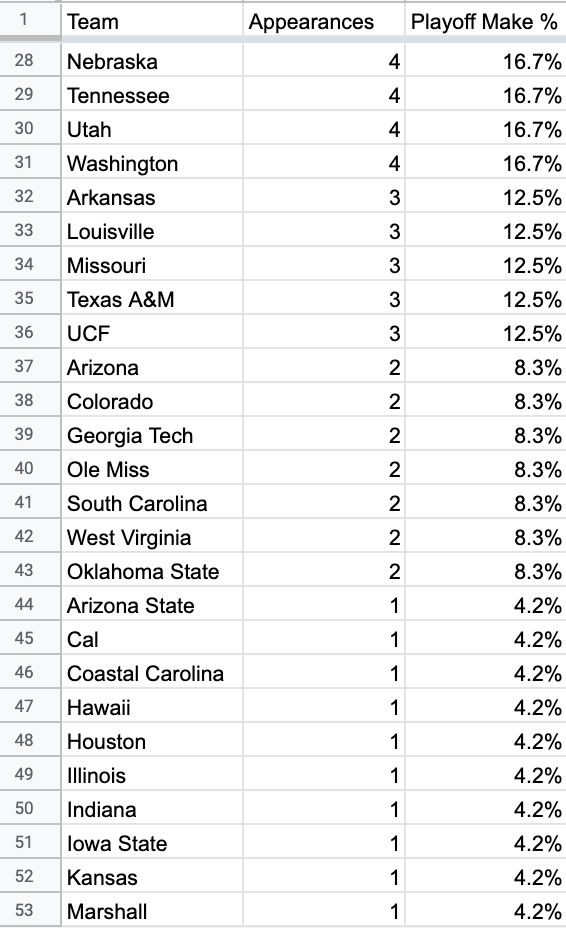 And the worst part is, 7 of the 13 teams that have made the CFP have only made it once, while the remaining 6 teams that have made multiple CFPs represent a full 25 of the 32 total playoff appearances since the 2014 season.