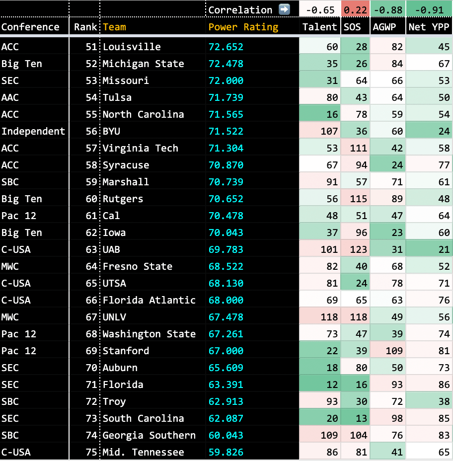 We are now a third of the way through the season already. I’ve altered the formula just a bit by adding Net Tackles for Loss. I just think it’s one of the most important stats in college football and I discovered a site that tracks it well, so I added it into the formula.