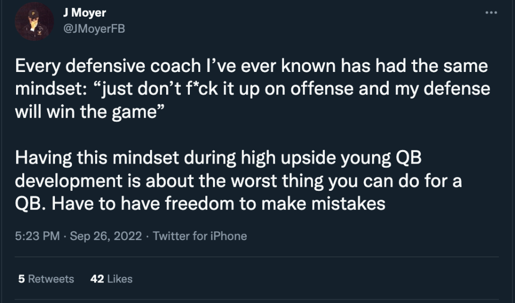 They always seem to have a defensive-minded head coach and an archaic offense. And when they get an offensive-minded head coach, he’s either fraudulent or saddled with a quarterback who is legitimately just not a great talent. Like consider Mitch Trubisky vs. Justin Fields. Is there any debate over which guy is a better quarterback prospect? It’s clearly Justin Fields even though the Bears took Trubisky #2 overall in the 2017 vs. Fields at #11 overall in 2021. Fields is the superior QB talent.