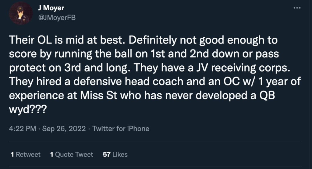 The Bears hired Matt Nagy to develop Trubisky, and Nagy was an offensive-minded coach, but Nagy couldn’t turn Mitch into a high quality NFL quarterback. Maybe that was because Nagy was a fraud, or maybe it was because Mitch Trubisky simply wasn’t good. He did not look good in his starts with the Steelers; he’s already been benched. But then again, Matt Nagy didn’t get any head coaching looks after being fired by the Bears. So maybe him and Mitch were both bad.